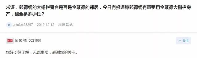 更有意思的是,有投资者听闻郭德纲的大栅栏舞台与全聚德比邻,且郭德纲有意租用全聚德大栅栏房产,特就此事向全聚德求证,并询问租金是多少。