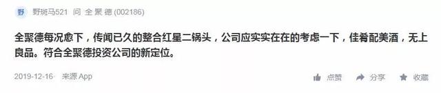 近日,有投资者留言称,全聚德经营业绩每况愈下,公司应实实在在考虑一下整合红星二锅头,正所谓“佳肴配美酒”。